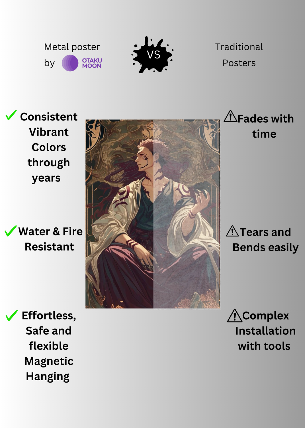At Otaku Moon, we blend cutting-edge innovation with centuries-old Japanese craftsmanship to create metal wall posters that are as durable as they are breathtaking. Designed for art lovers who demand vibrancy, versatility, and longevity, our posters are handmade using futuristic techniques to deliver superior color contrast, remarkable detail, and a glossy finish that brings every artwork to life.