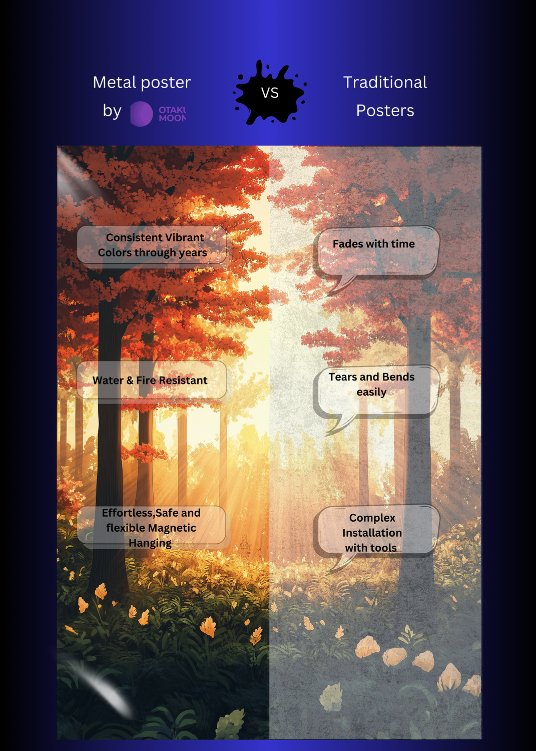 At Otaku Moon, we blend cutting-edge innovation with centuries-old Japanese craftsmanship to create metal wall posters that are as durable as they are breathtaking. Designed for art lovers who demand vibrancy, versatility, and longevity, our posters are handmade using futuristic techniques to deliver superior color contrast, remarkable detail, and a glossy finish that brings every artwork to life.
