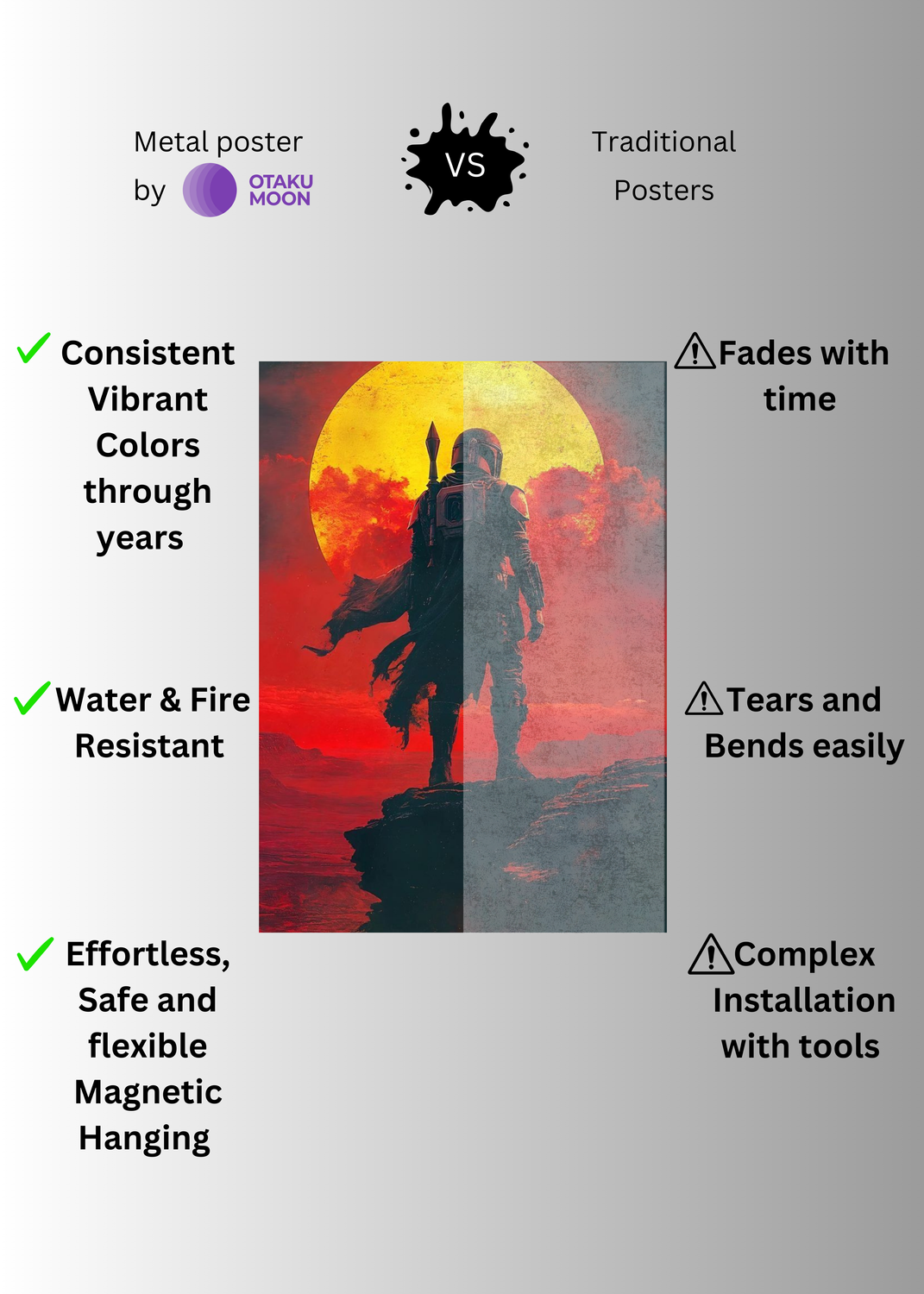 At Otaku Moon, we blend cutting-edge innovation with centuries-old Japanese craftsmanship to create metal wall posters that are as durable as they are breathtaking. Designed for art lovers who demand vibrancy, versatility, and longevity, our posters are handmade using futuristic techniques to deliver superior color contrast, remarkable detail, and a glossy finish that brings every artwork to life.