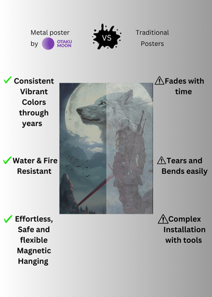 At Otaku Moon, we blend cutting-edge innovation with centuries-old Japanese craftsmanship to create metal wall posters that are as durable as they are breathtaking. Designed for art lovers who demand vibrancy, versatility, and longevity, our posters are handmade using futuristic techniques to deliver superior color contrast, remarkable detail, and a glossy finish that brings every artwork to life.