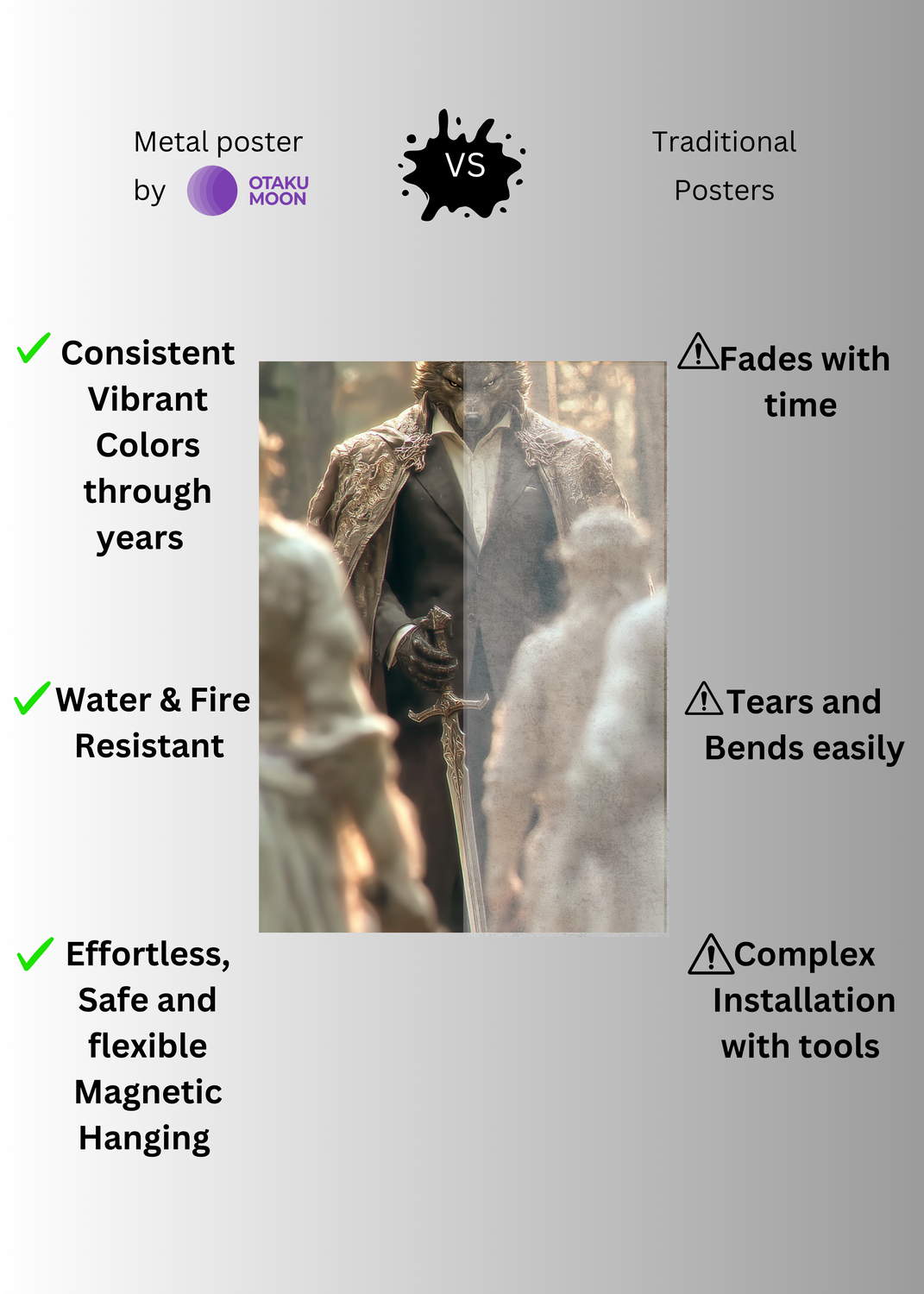 At Otaku Moon, we blend cutting-edge innovation with centuries-old Japanese craftsmanship to create metal wall posters that are as durable as they are breathtaking. Designed for art lovers who demand vibrancy, versatility, and longevity, our posters are handmade using futuristic techniques to deliver superior color contrast, remarkable detail, and a glossy finish that brings every artwork to life.